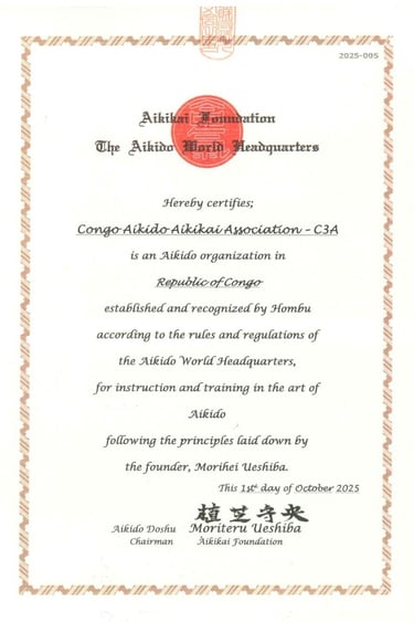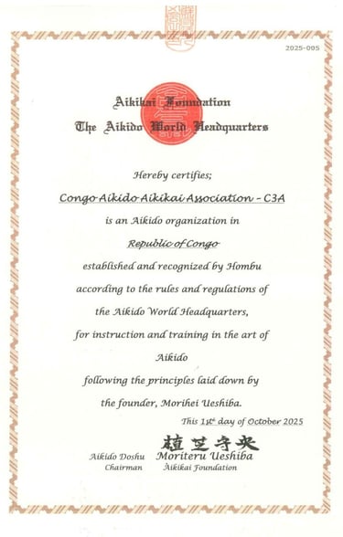 C’est avec une immense fierté que la Congo Aïkido Aïkikaï Association (C3A) annonce sa reconnaissance officielle par le Hombu Dojo — siège mondial de l’Aïkido à Tokyo, Japon.